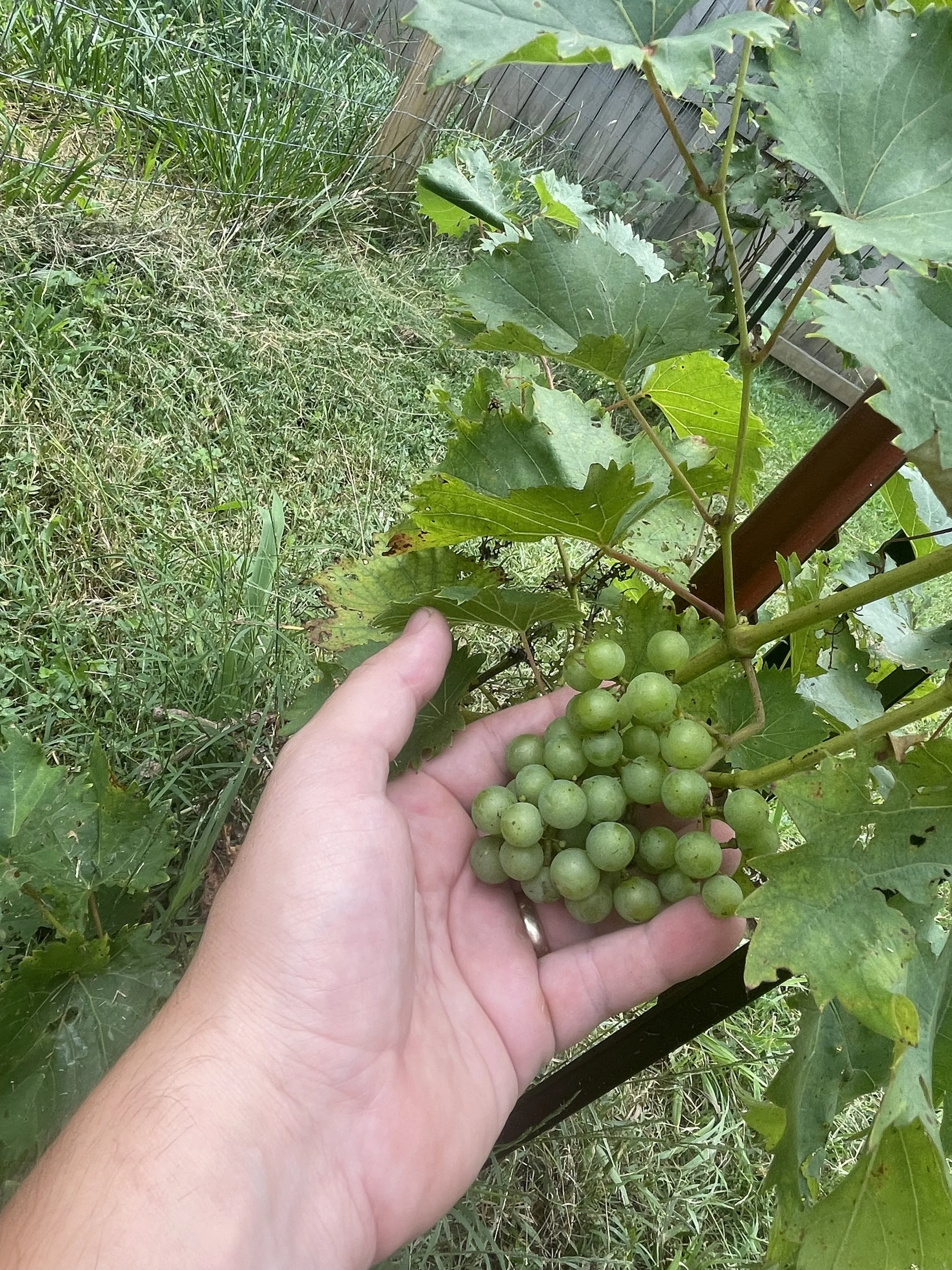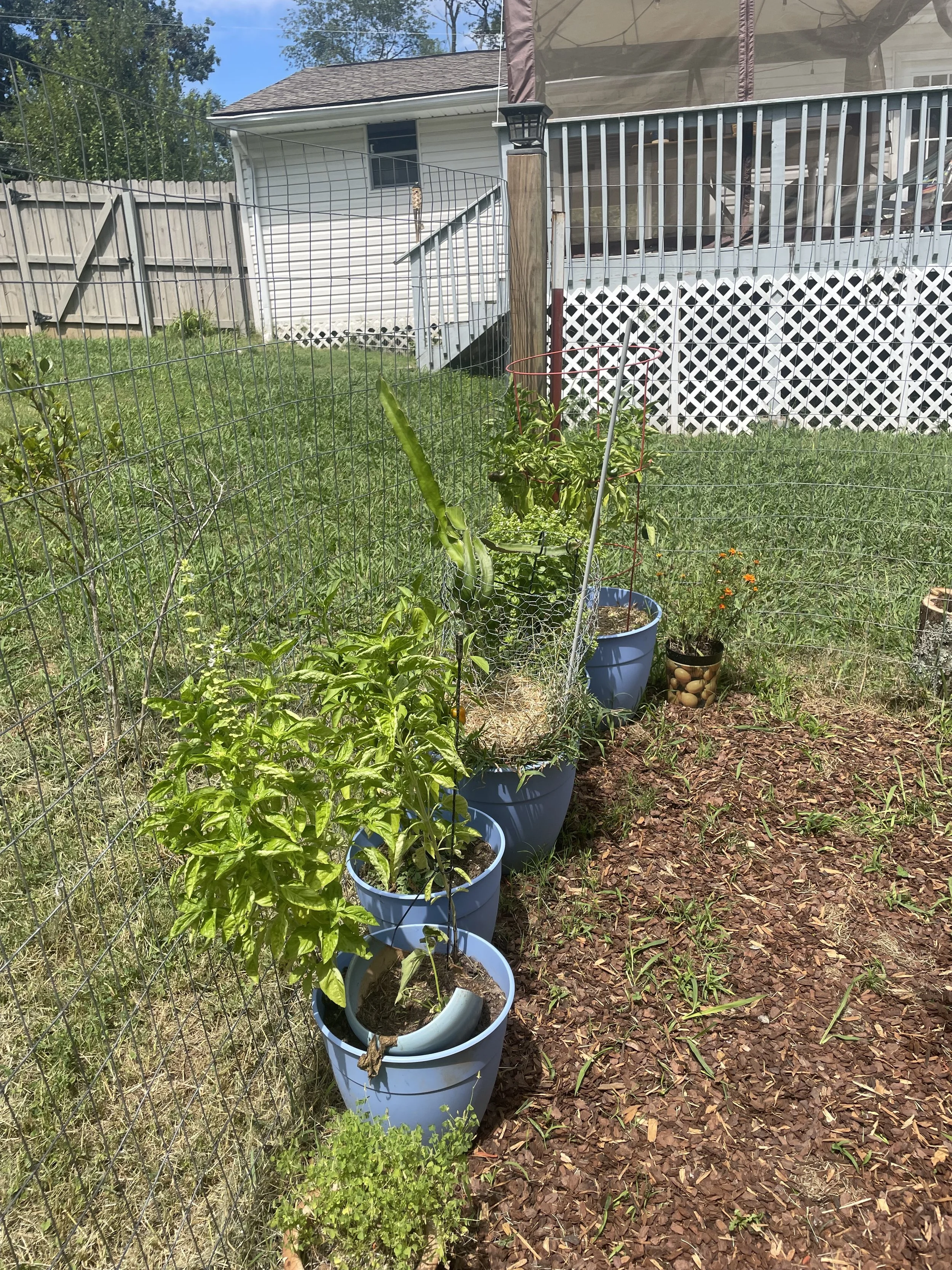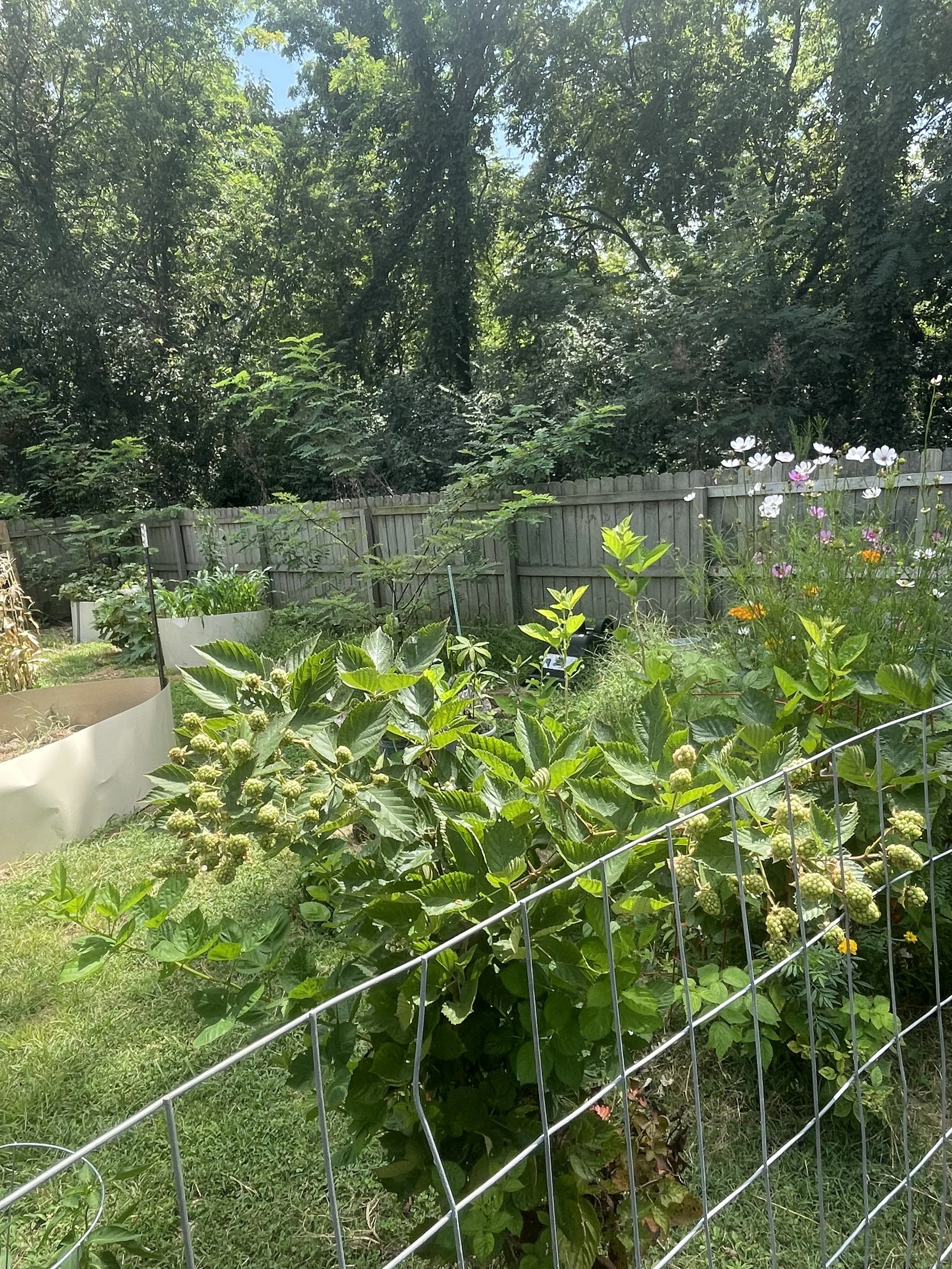 The full list so far is as follows: Limes, Lemons, Apples, pomegranate, blackberries, blueberries, raspberries, Plums, Grapes(green, purple and muscadine), multiple types of bell peppers, banana peppers, squashes, zucchini, beans, potatoes, corn, onions(green, chives, white onion), basil, watermelon, and probably a couple more!
