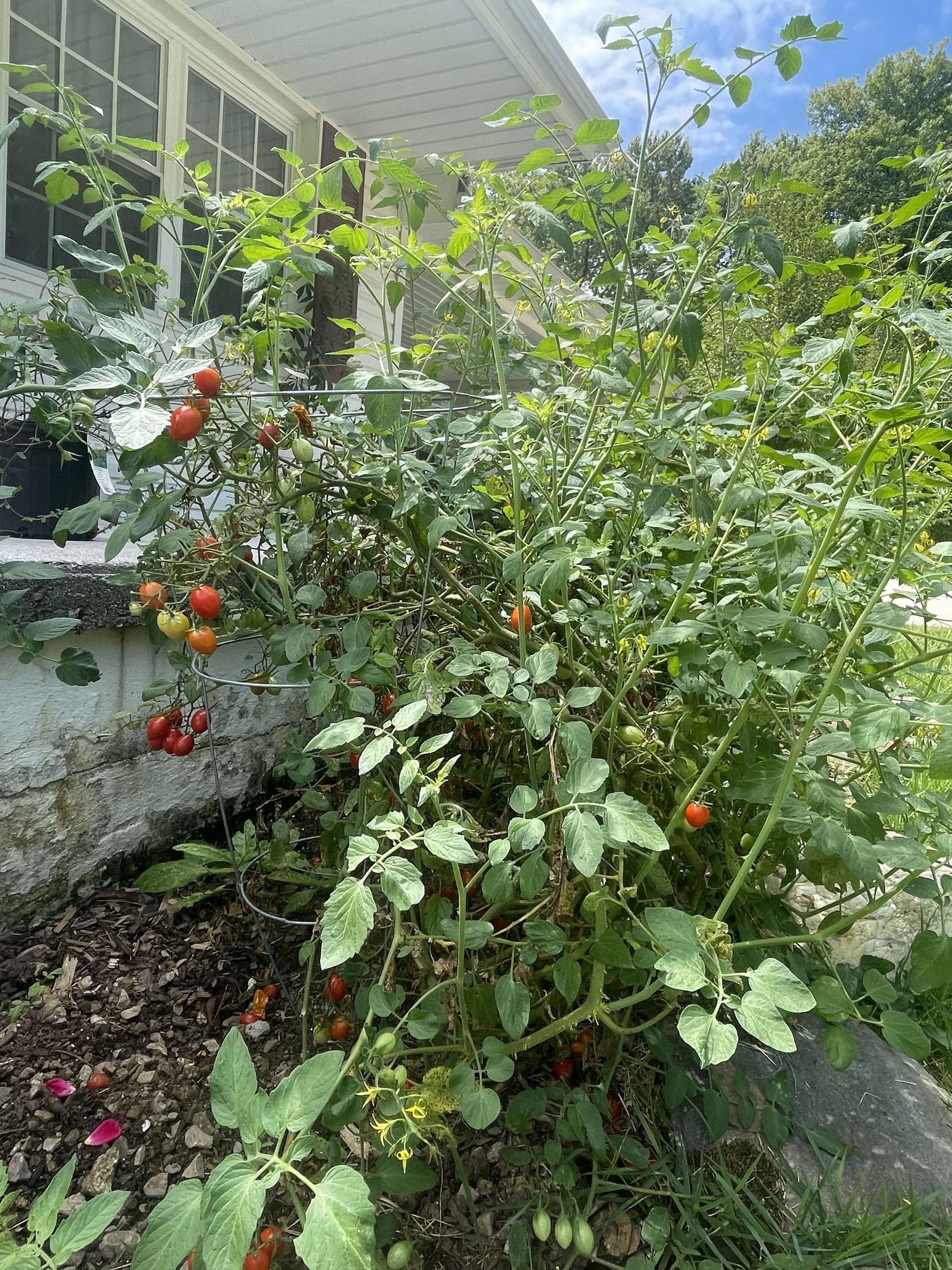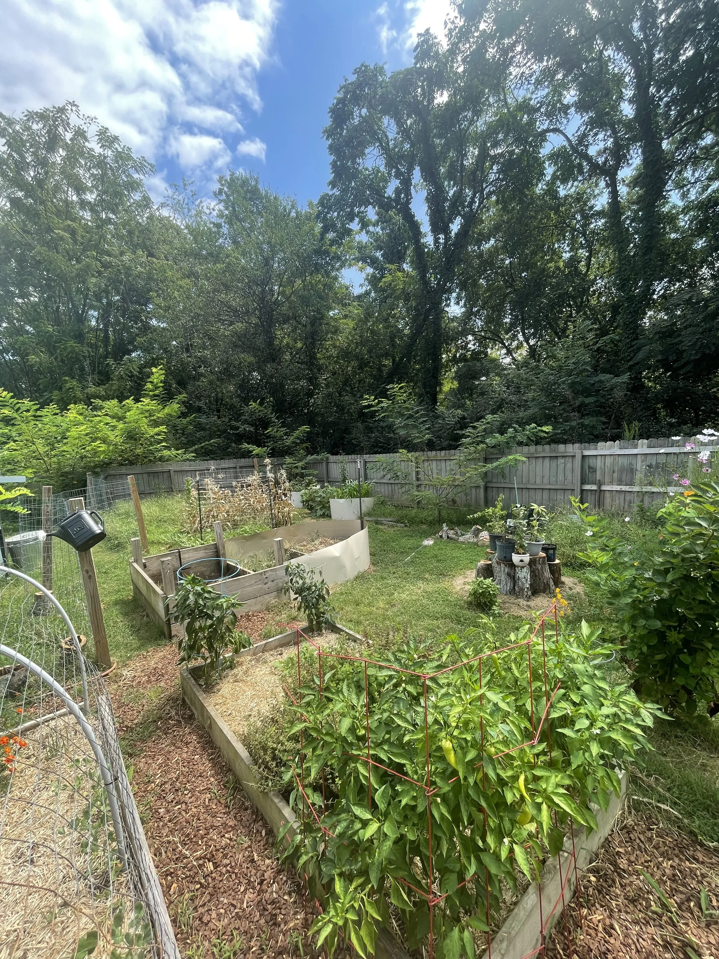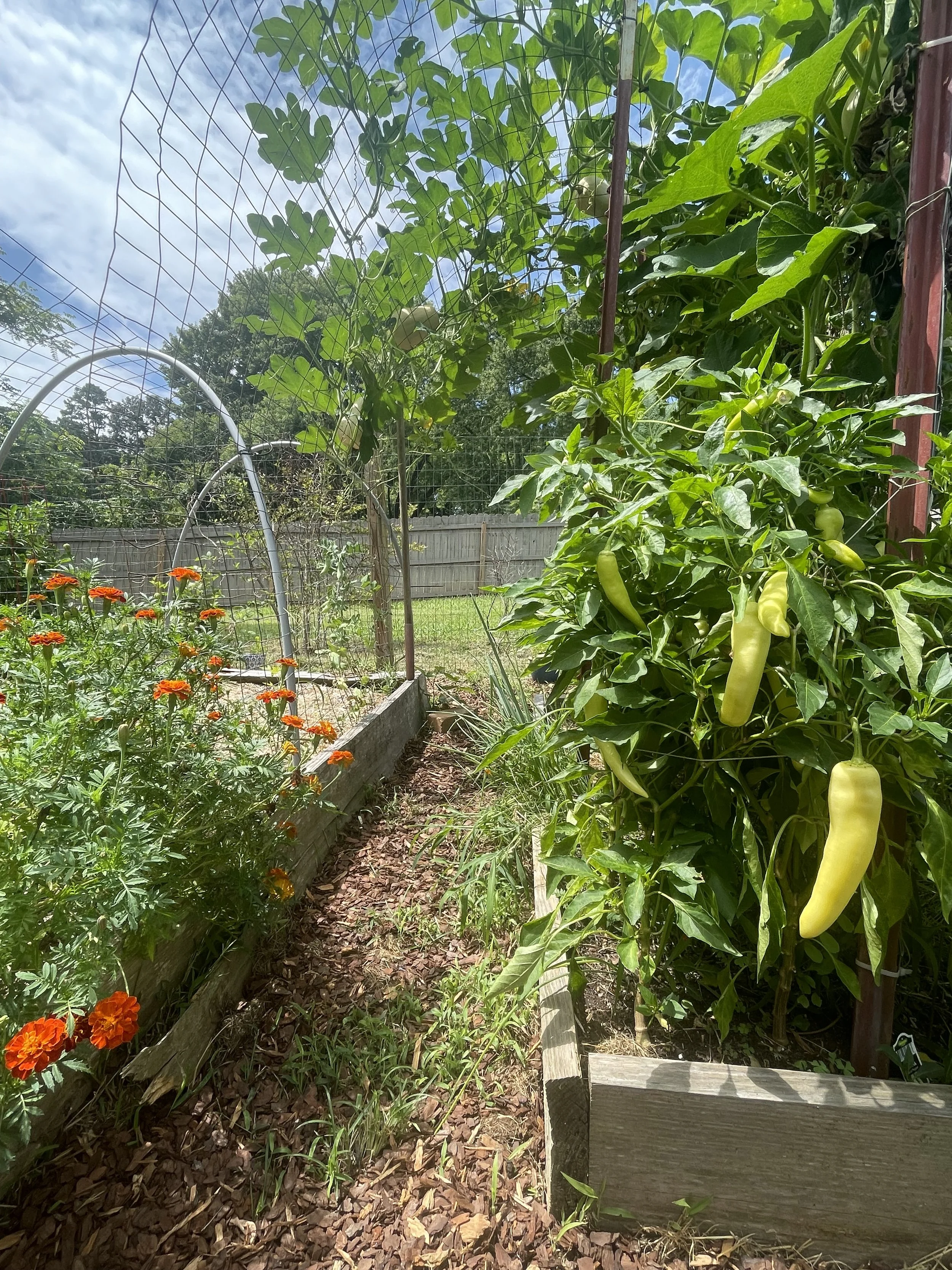 The full list so far is as follows: Limes, Lemons, Apples, pomegranate, blackberries, blueberries, raspberries, Plums, Grapes(green, purple and muscadine), multiple types of bell peppers, banana peppers, squashes, zucchini, beans, potatoes, corn, onions(green, chives, white onion), basil, watermelon, and probably a couple more!